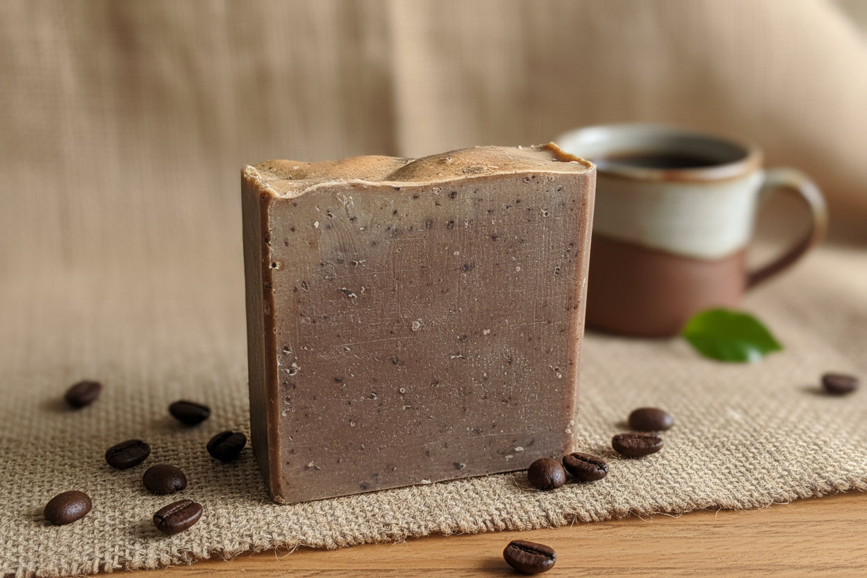Morning Coffee (3.5 oz) Scent Warm, cozy coffee shop, nutty hazelnut aroma. Ingredients:Water, Peanut Oil, Coconut Oil, Palm Oil, Sodium Hydroxide, Castor Oil, Fragrance Oil, Coffee Grounds, Sodium Lactate and Mica (Faint scent)